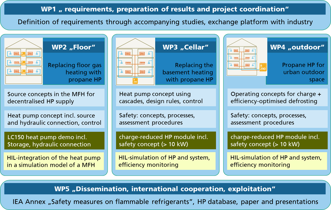For the replacement of the central heating in the basement, heat pumps with a larger capacity are to be developed. Here, results from the “LC150” project will be used to transfer refrigerant reduction to larger capacities. In addition, concepts for interconnection and control of multiple heat pumps will be investigated and widely implementable safety concepts will be identified and tested.